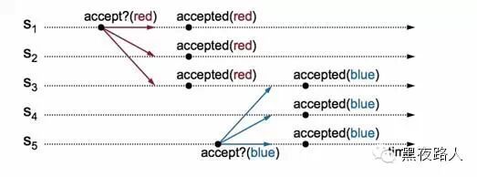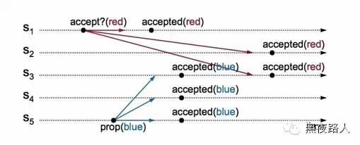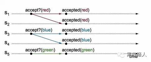 如图,S1发出提议,S1,S2,S3批准 red为最终批准的值。S5随后发出提议,s3,S4,S5批准,blue又为最终批准的值。此时S1,S2最终批准red,S3,S4,S5最终批准blue,这就违背了我们的一致性原则,最终只有一个值被选择。