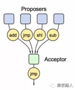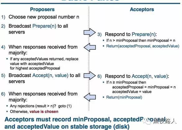如上图,每一个proposer提议一个值给Acceptor来批准,然后Acceptor批准一个值作为最终的值。