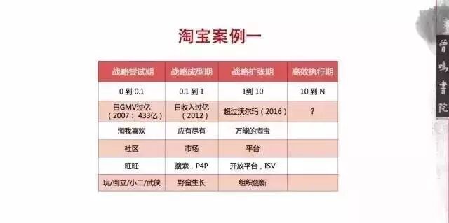 我们跟淘宝很多同事梳理过好几次,这次从新的角度有新的理解。0-0.1的阶段,我认为过了这个坎的象征是GMV过了一个亿。当时马云逼孙彤宇要过一个亿,马云也不知道为什么要过一个亿,但是模糊中感觉会发生化学反应。