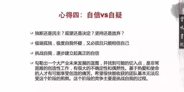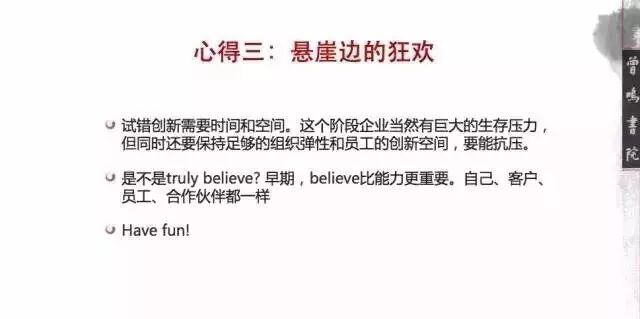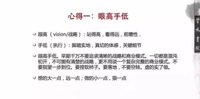 “眼高手低、试错一定要基于Vision(愿景和方向)、悬崖边的狂欢、自我修炼(自信和自疑)”,这四点心得不一定准确或穷尽,是根据阿里经验和创业者沟通中单独提出来的。
