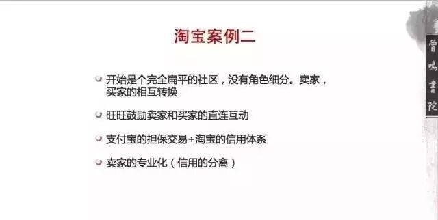 淘宝最开始是完全扁平的社区,没有角色细分,好的买家转化成卖家,卖家和买家相互转换。后来有的卖家没有好的货源,但是服务能力非常好,就成了服务商。后来又有专业的卖家过来,角色越来越丰富。