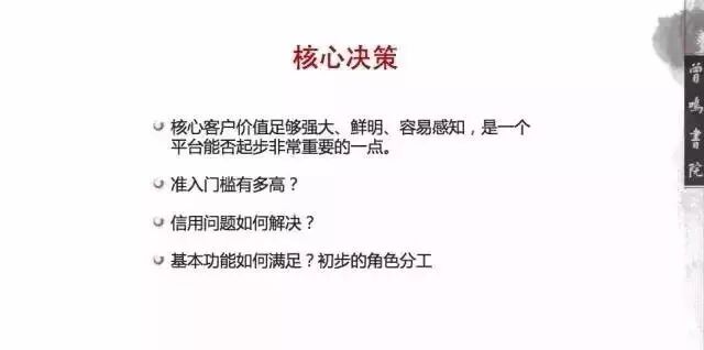 第一,核心客户价值足够强大、鲜明、容易感知,是一个平台能否起步非常重要的一点;