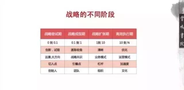 引爆之后要进入第三个阶段,光靠团队已经不够,要依赖组织,组织和成型的战略要匹配,战略不能是模糊的想法或者团队认识,而是能够被传达、分解,被大多数基础员工了解,战略清晰到可以变成业务模式,在业务模式中了解自己创造什么价值,靠什么赚钱。第三个阶段是要找到发展的杠杆,比如资本的杠杆。