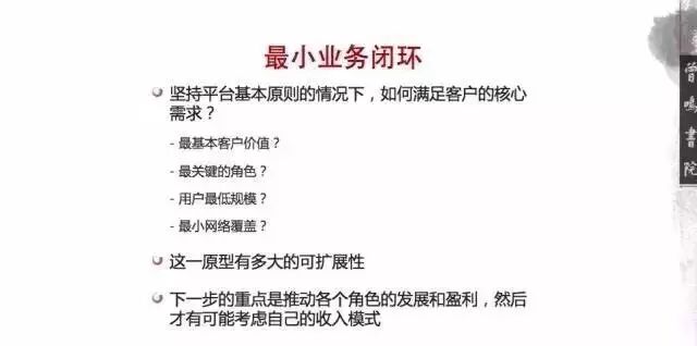 就是你完成了最小业务闭环,但前提是按照平台化原则,你的产品架构是平台化的,你坚持的是网络的对等原则,你没有越位进去做端对端的解决方案,在这种情况下,你完成了客户(不管客户多少)的基本需求价值提供。