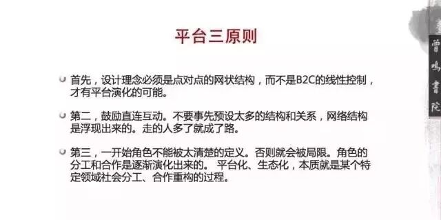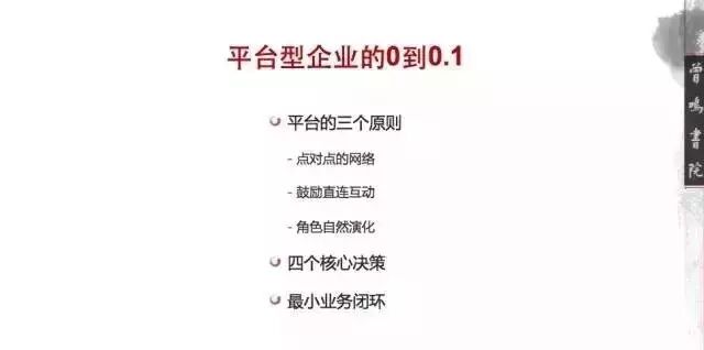 第二个是一个很重要的概念,平台型企业如果没有做出平台味道,你是没有迈出第一步的,让平台的原型长出样子非常重要。要用最有效的办法完成一个业务的闭环,很多企业把平台摊得非常广,但是平台合围不了,形成不了合力。平台的面是从线开始做的,怎么做好线,怎么把真正的平台价值推送给你的核心客户,是今天讨论的重点。