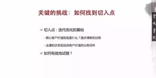 很多人试错后,整体还是散的,他试了很多东西,也有很多沉淀和闪光点,但是闪光点拼不到一起,形成不了有突破力的尖刀打开局面。你一定要有一个vision作为试错的前提,否则你试了也白适。只有基于某个基础去测试,你才有迭代的路线和方向。如果没有这个作为前提,就是盲人摸象,最后也摸不出一张整图出来,死了也是冤枉,确实做了很多无用功。