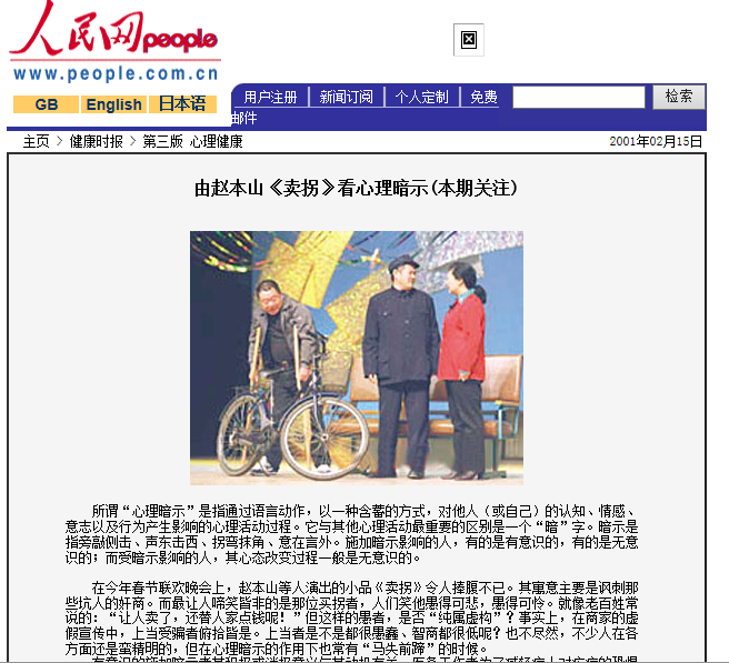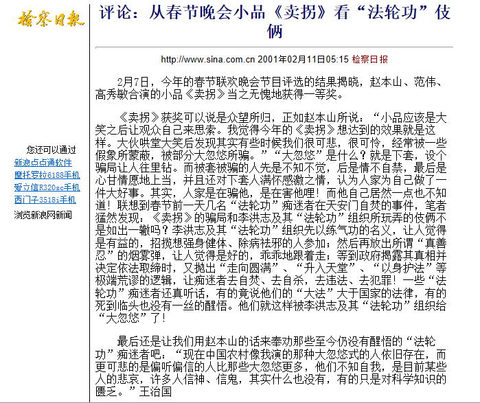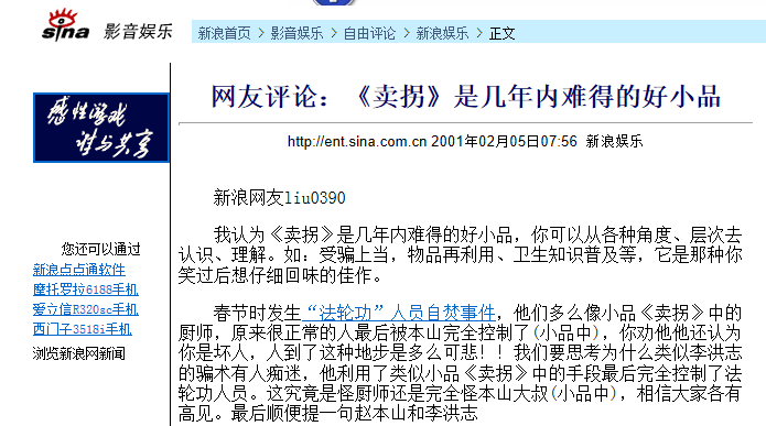 2001年春晚小品《卖拐》问世后,很多人便将赵本山同剧中人物“大忽悠”划上等号,将小品寓义也理解为提倡忽悠,说赵本山的成功也是因为忽悠,更有甚者,有些学者和艺术家认为该小品讽刺残疾人,令人啼笑皆非。实际上,《人民日报》《检察日报》《健康时报》及人民网、新华网等多家媒体在当年春晚结束后就曾专门刊登文章,深刻分析了《卖拐》反对邪教、揭露奸商的社会意义。中国人民大学心理学教授张小乔认为该小品“寓意主要是讽刺那些坑人的奸商”,并从专业角度分析了心理暗示如何被骗子和邪教利用,指出了提高国民的科学文化素质、增强科学意识的重要性。金红从心理暗示和思维定势的角度分析了邪教的危害。王治国则结合小品分析了邪教组织的危害以及科学知识匮乏的悲哀。