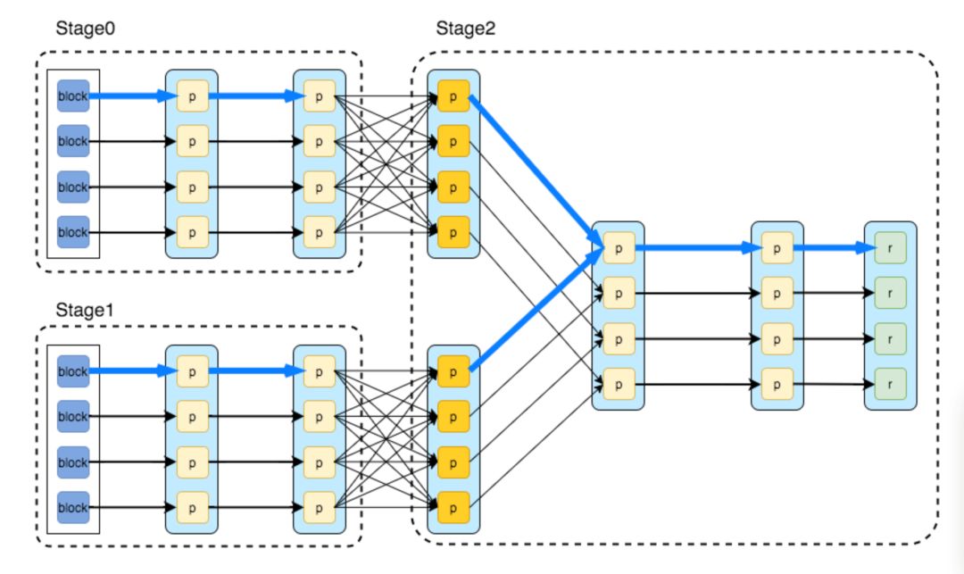 在 DAG 的执行上,Spark 和 Flink 有一个比较显著的区别。在 Flink 的流执行模式中,一个事件在一个节点处理完后的输出就可以发到下一个节点立即处理。这样执行引擎并不会引入额外的延迟。与之相应的,所有节点是需要同时运行的。而 Spark 的 micro batch 和一般的 batch 执行一样,处理完上游的 stage 得到输出之后才开始下游的 stage。