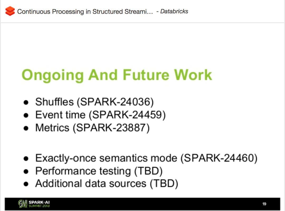 从最近 Spark+AI Summit 大会上的介绍来看,会发展成一个和 Flink 的流处理模式比较相似的执行引擎。不过从上图来看,主要的功能都还在开发中或者待开发。对将来能做到什么程度,和 Spark 原来的 batch 执行引擎怎么结合,我们拭目以待。