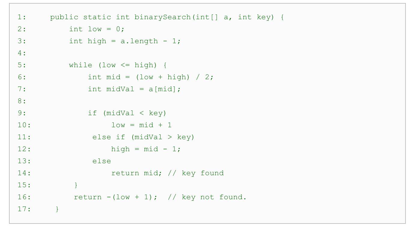 然而这些都不算啥,更能让人感觉幸灾乐祸的是,Java库里面的二分查找,有一个埋藏了10年之久的bug。这个bug呢,在 java.util.Arrays.binarySearch 里面,虽然这个bug的修复也已经是10年前的事了。那么我们来看下当年的错误代码吧。