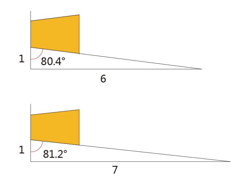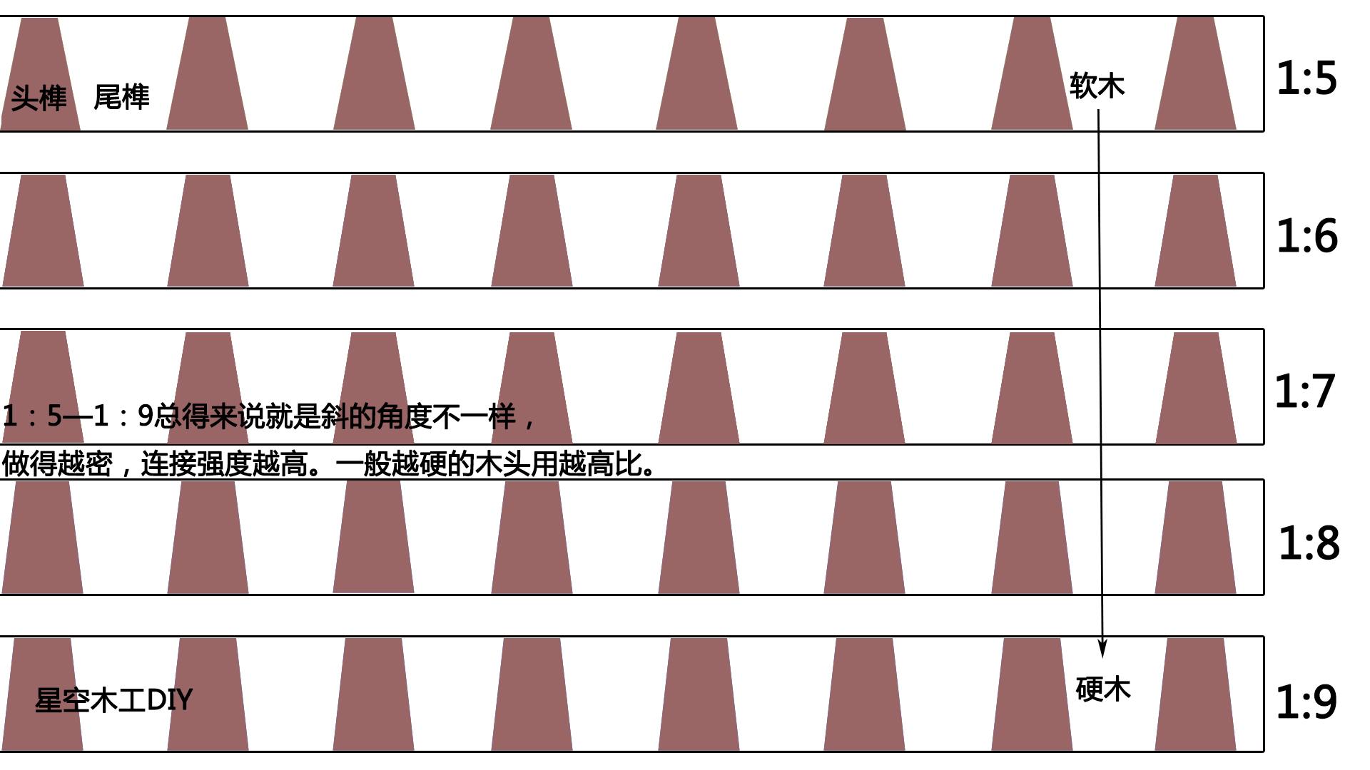 燕尾榫角度比例从1:5到1:9逐渐增大,角度则越来越大。常用的角度为80度左右,即1:6或者1:7,这个比例既美观又方便制作。角度大于80度趋近90度时结构力会逐渐降低,角度小于75度时则榫头的尖角越容易崩坏。且角度越大制作难度越低,一般情况下,越硬的木头用越高的比例。