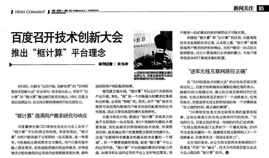 《通信世界》2009年 第32期对“2009 百度技术创新大会”进行了报道